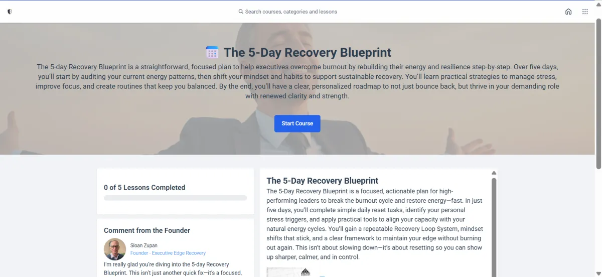 The 5-Day Recovery Blueprint is a focused, actionable plan for high-performing leaders to break the burnout cycle and restore energy, fast.
